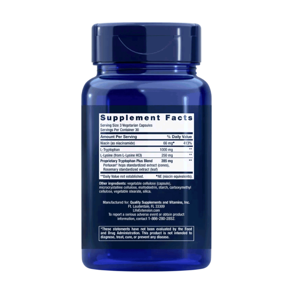 Geoptimaliseerde Tryptofaan Plus van Life Extension combineert L-Tryptofaan, L-Lysine en gepatenteerde extracten van hop (Perluxan®) en rozemarijn (Ursole™). Deze formule is ontworpen om de productie van serotonine te ondersteunen, wat helpt bij het bevorderen van een gezonde geestelijke balans en nachtrust. Bovendien bevat het supplement niacine (vitamine B3), bekend om zijn brede gezondheidsvoordelen, zonder het risico op een flush-effect.