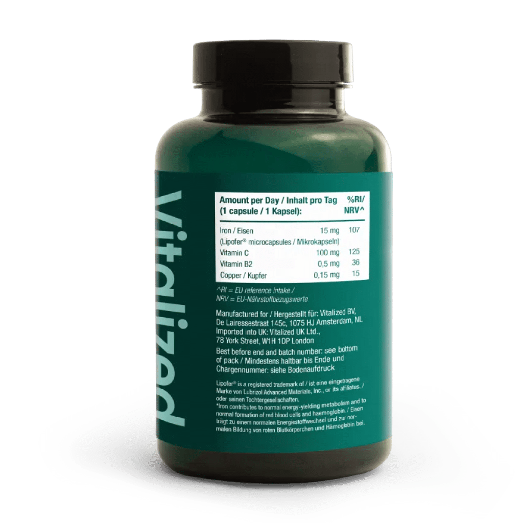 Ijzer+ 15 mg van Vitalized is een moderne ijzerformule met goed opneembare microgecapsuleerde ijzer (Lipofer®), aangevuld met vitamine C, B2 en koper. Deze combinatie ondersteunt de aanmaak van rode bloedcellen, het zuurstoftransport en een gezond energieniveau. De formule is veganistisch, glutenvrij en vrij van onnodige hulpstoffen.