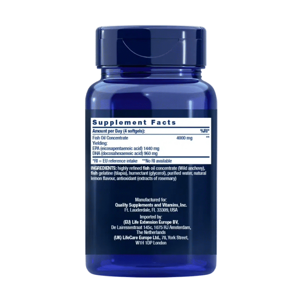 Mega EPA/DHA van Life Extension is een zuivere, krachtige omega-3-formule met 1440 mg EPA en 960 mg DHA per 4 softgels. Deze essentiële vetzuren zijn afkomstig van duurzaam gevangen vis uit de Zuidelijke Stille Oceaan en worden verwerkt in een citroensmaakformule zonder visachtige nasmaak.