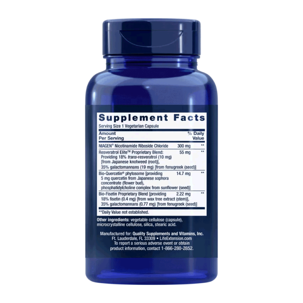 Dit product bevat 300 mg nicotinamide riboside (als NIAGEN®), een vorm van vitamine B3 waarvan bekend is dat het kan worden omgezet in NAD+. Daarnaast is er een ‘ultra-bioavailable’ trans-resveratrol en fisetine- en quercetine-complex (verrijkt met fenugreek-galactomannans), bedoeld om de opname van deze natuurlijke polyfenolen te verhogen. Door deze combinatie krijg je meerdere werkzame stoffen binnen in één dagelijkse capsule.