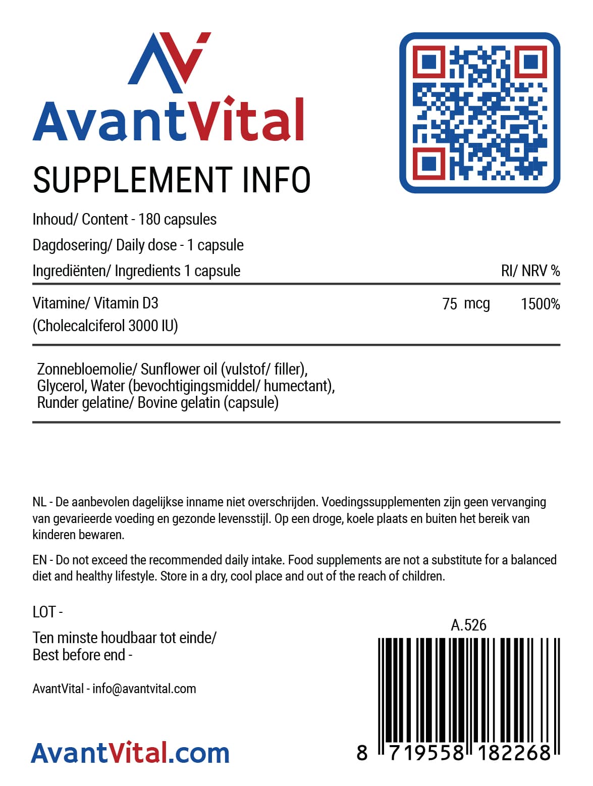 Vitamine D3 (cholecalciferol) is een vetoplosbare vitamine die van nature voorkomt in sommige voedingsmiddelen en die het lichaam zelf kan aanmaken door blootstelling aan zonlicht. In deze formule van AvantVital komt de vitamine D3 uit cholecalciferol, een hoogopneembare vorm die wordt opgeslagen in het lichaam en het immuunsysteem, de spierfunctie en de gezondheid van de botten ondersteunt. Een regelmatige inname van vitamine D3 is vooral van belang in de wintermaanden, wanneer blootstelling aan zonlicht vaak minder is.