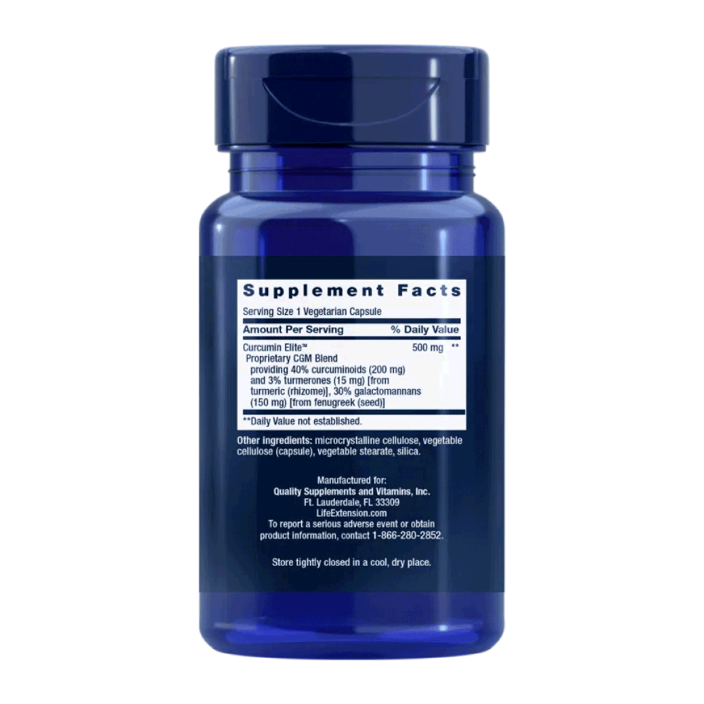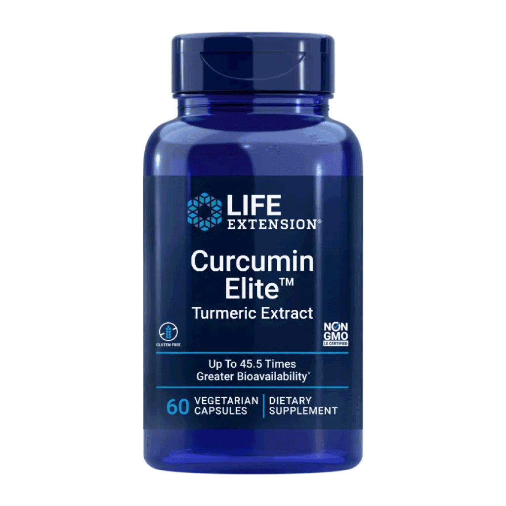 Curcumin Elite™ Turmeric Extract by Life Extension is a turmeric supplement with a patented combination of curcumin and fenugreek fibers (galactomannans). This unique formula is designed to enhance the bioavailability of curcumin, allowing the active components to resist breakdown and be better absorbed by the body.