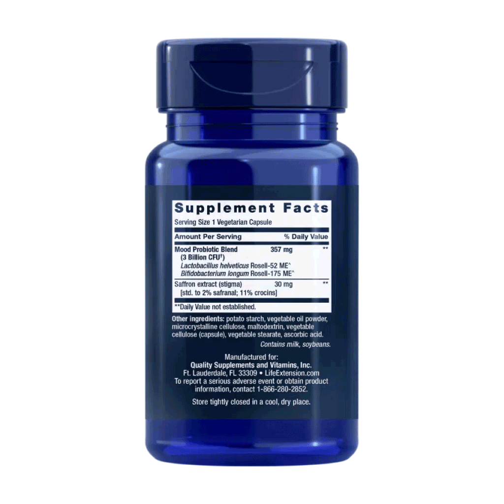 Available in a convenient resealable jar containing 30 capsules, each featuring a unique combination of carefully selected probiotic strains and 30 mg of standardized saffron extract.