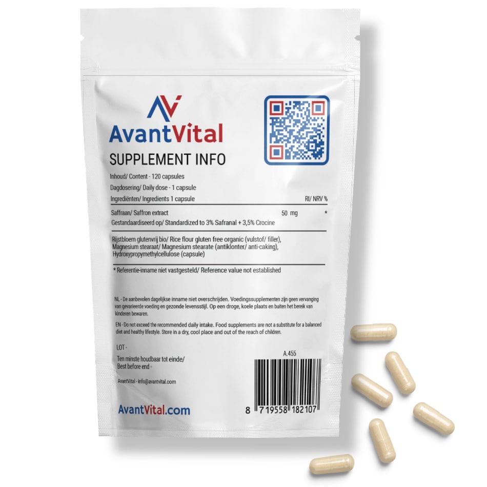 AvantVital’s saffron supplements stand out from other products due to their high quality and precision. Each capsule contains 50 mg of pure saffron extract, carefully standardized to 3% Safranal and 3.5% Crocin. These specifications ensure that you enjoy the essence of high-quality saffron with every use. Moreover, we offer this supplement in a practical, resealable package containing 120 capsules, with each capsule holding 50 mg of saffron extract.
