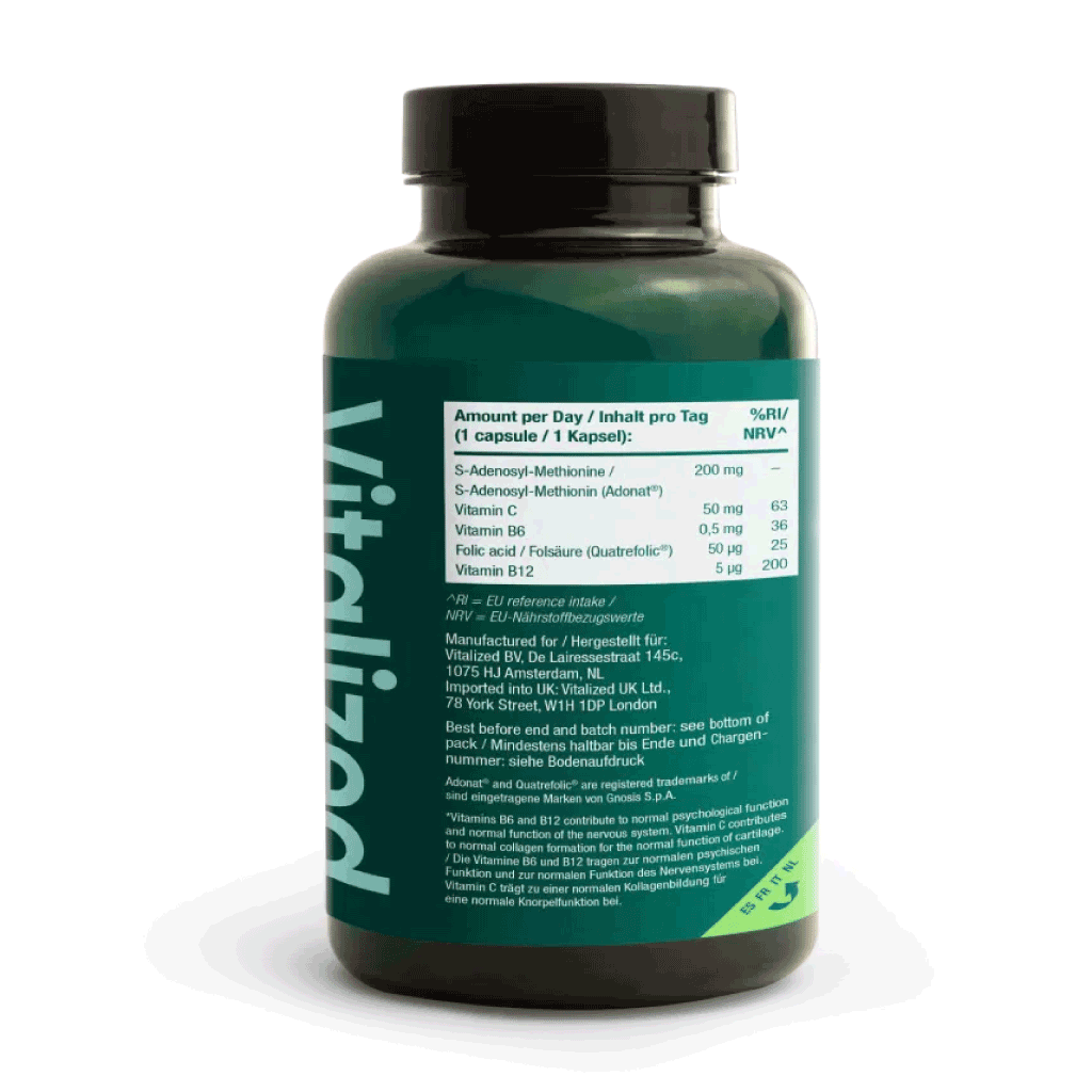 SAMe (S-Adenosyl-L-methionine) is a naturally occurring substance primarily produced in the liver from the amino acid methionine. Vitamins B6, B12, and folate contribute to normal psychological function and the normal functioning of the nervous system (EFSA). Vitamin C contributes to normal collagen formation for the normal function of cartilage. This makes SAMe+ 200 mg a comprehensive formula for daily supplementation. The product is suitable for vegans and is gluten-free.