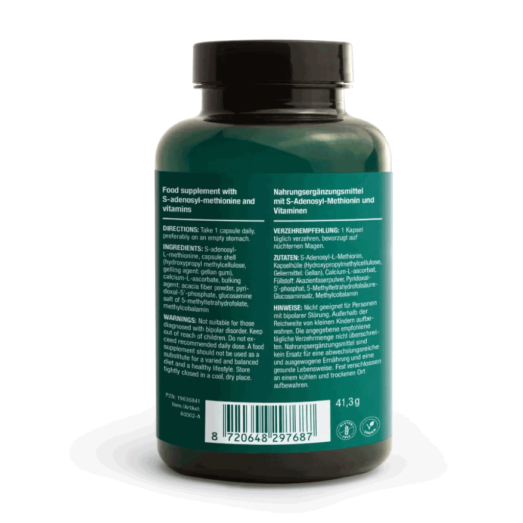 In accordance with European health claims regulations, we cannot make specific claims about the effects of S-Adenosyl-Methionine (SAMe). We provide only general product information. For personal health advice, it is recommended to consult a (para)medical professional.